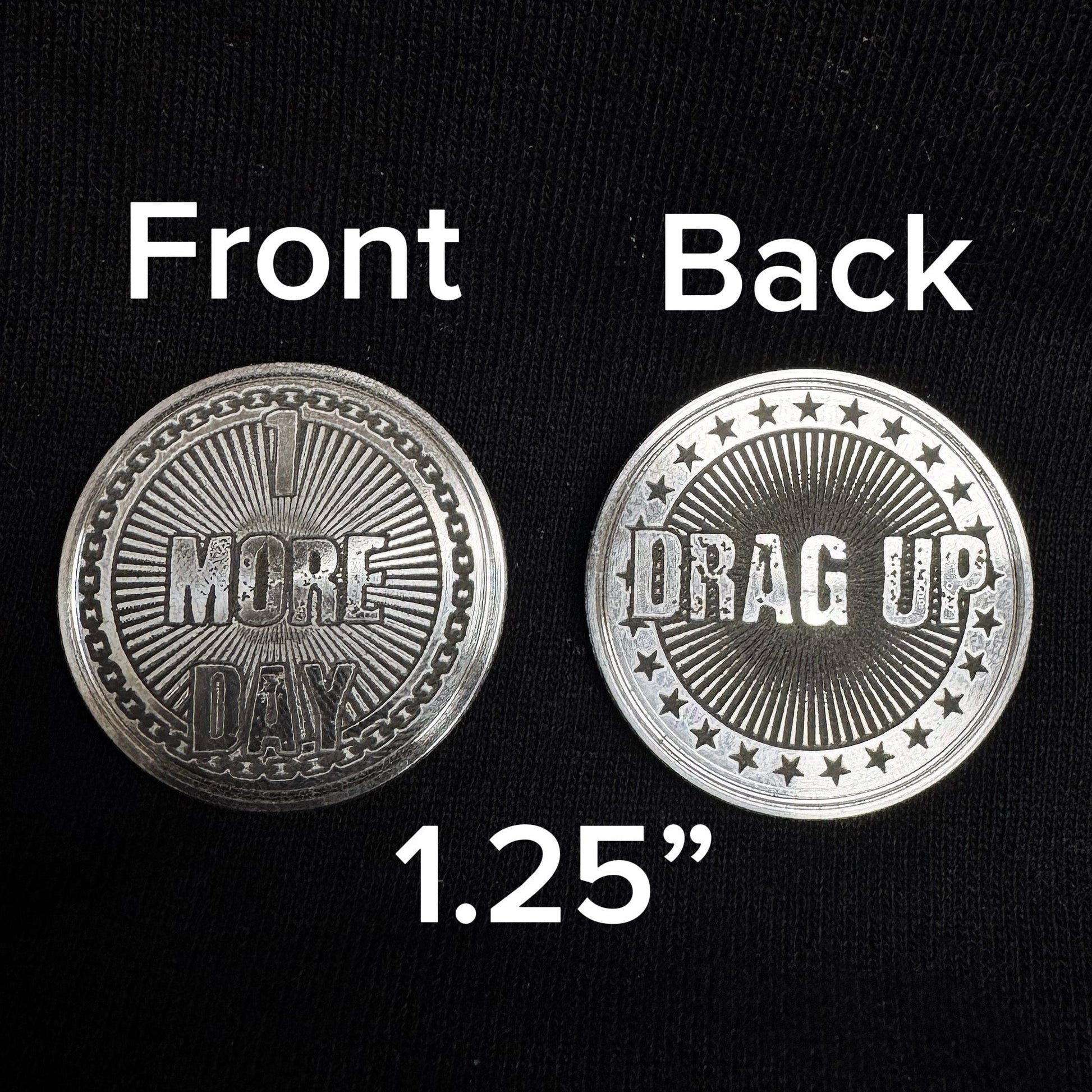 smaller coin is 1.25” with a ridged edge. Coins are aluminum and engraved. All Coins will vary slightly in finish!